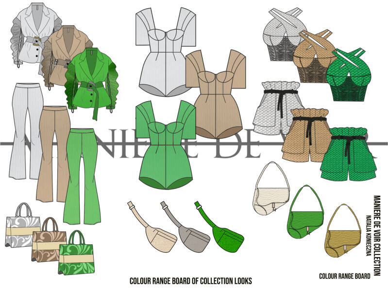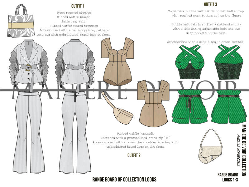 As a part of my job application for Junior Womenswear Designer at Manière De Voir, I have been set a design task to create a concept collection to accompany my application. I have used my skills with Photoshop and Illustrator to produce the design pages. This collection is made up of 3 garments for a separate occasion in 3 different colours ways, a range board, a colour range board, and a detailed tech pack for one of the outfits.